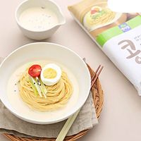 コングクスとは、韓国の夏の定番料理である冷たい豆乳スープの麺料理のことです。韓国語で「コン」は豆、「ククス」は麺を意味します。 大豆を原料にした豆乳スープに麺を入れ、夏場に冷やして食べるのが一般的です。 大豆の香ばしさとミルクのようなさっぱりした味が格別です。 自然な甘みとコク、豆乳の豊かな味わいを感じることができます。