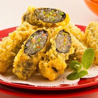 韓国はるさめを海苔で巻いて天ぷら衣をつけて揚げた天ぷらです。